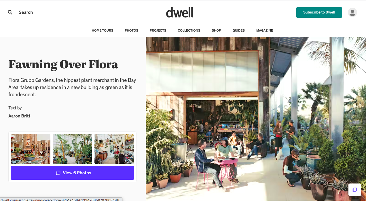The press has been wonderfully supportive of Flora Grubb Gardens. House and Garden named Flora a tastemaker in 2007, and in 2008 she was included as one of the “Hot 20 under 40” in 7x7. In 2012, she was honored as part of Martha Stewart’s American Made Awards. Flora Grubb Gardens has been profiled in dozens of publications, including Sunset, Garden Design, Travel & Leisure, Domino, and Dwell magazines, and in The New York Times.