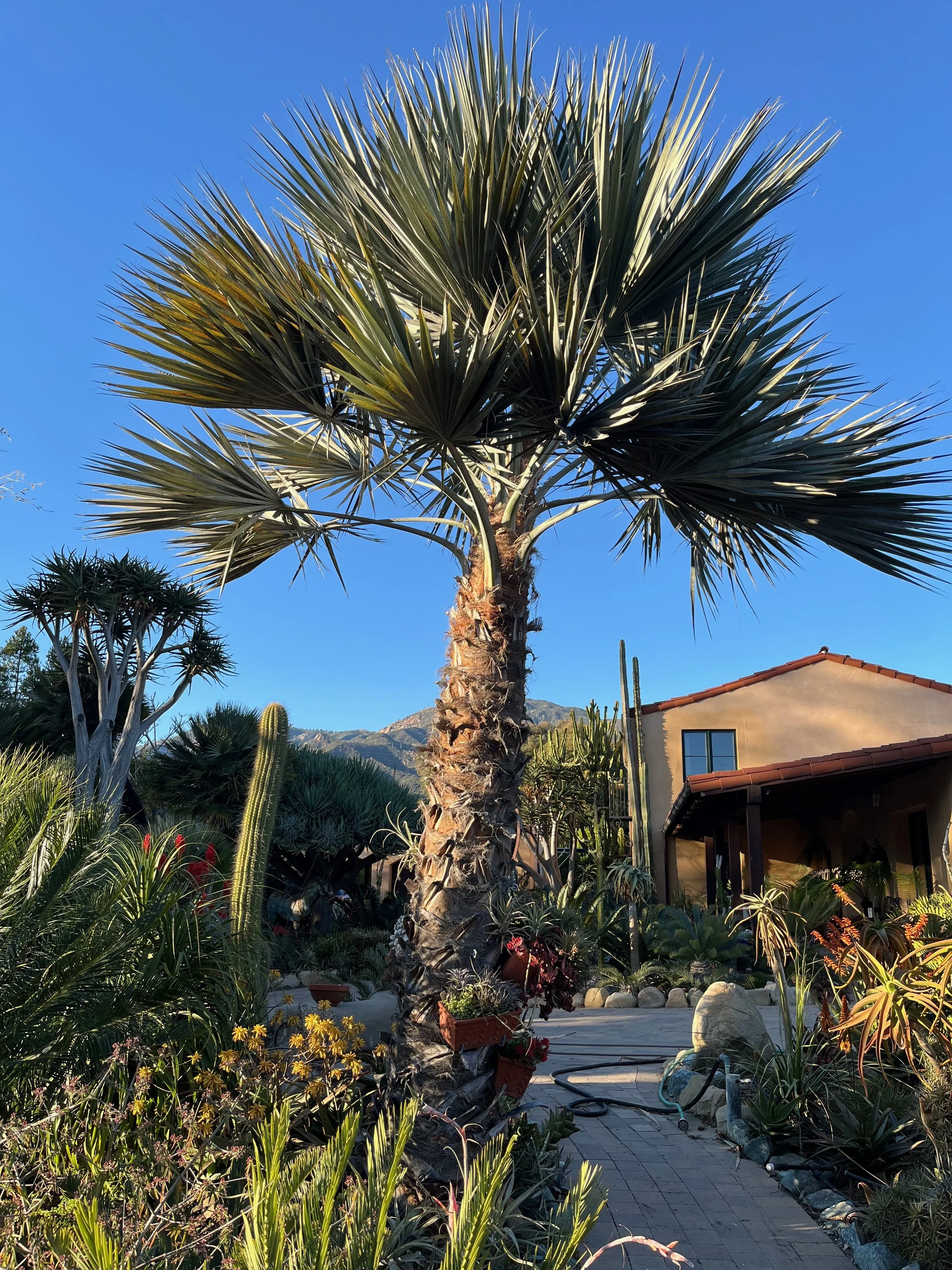 The dry garden is a place we cultivate for harvest, beauty, and life outdoors without overdoing the water in our summer-dry coastal California climate. But a dry garden can take many different forms. We might gather the gorgeous curiosities of desert plants like cactus and succulents, or we might create a meadowy low-water space lit with seasonal flowers. Palms, with all their beauty and versatility, can play an important role in many types of dry gardens, helping to create a distinct sense of place.
