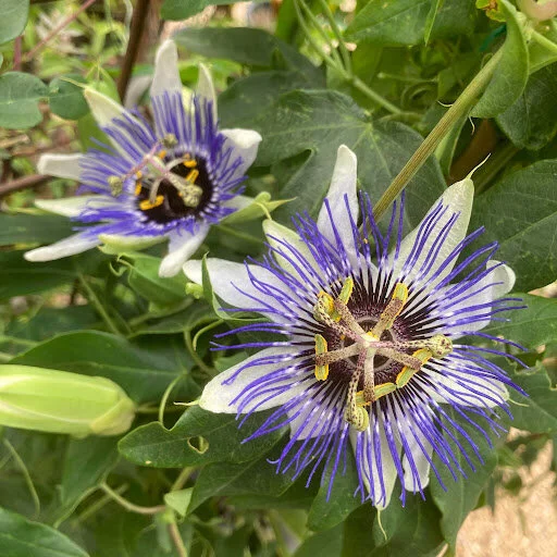 Passion flowers like as much sun as they can get, but you’ll find they grow well in part shade or even full bright shade, though they will be thinner and with fewer flowers. These vines are known for aggressive growth and it’s important to situate them in a spot where they can spread out. Covering entire fences, sheds and even houses is a superpower of many of the larger Passiflora. Don’t like that chain link fence? Wait, where’s that chain link fence? Their tendrils will grab onto just about anything, pulling their way upward. They are very hard to train down, and as such it’s better to train them along the base of a building or fence first and then let them climb up from there.