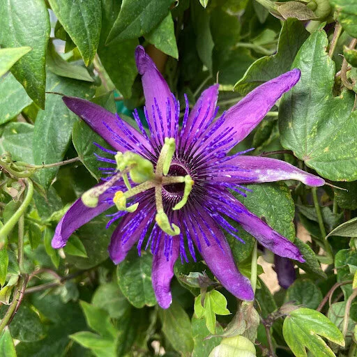 P. ‘Witchcraft,’ (23℉) 15-20 ft. Aptly named, this pure dark purple flower is spellbinding! Witchcraft’s unusual reflexed petals open up the flower, giving it a unique posture. Unlike other Passiflora, which are generally multicolored, this one is purple on purple on purple! 3-inch flowers.