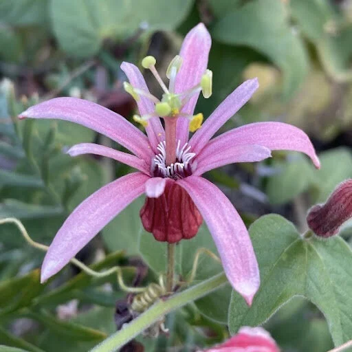 P. sanguinolenta, (28℉) 5-10 ft. This unusual Passiflora has bi-lobed “bat wing” leaves. The overall plant, including leaves and flowers, is small in stature, making it a great candidate for smaller gardens, fences, and railings. While the coral pink star-shaped flowers aren’t as dramatic as many of the hybrids, they are beautiful in their own unique way. This vine is purported to flower better in shade than other passifloras. Sanguinolenta is one of the best passion flowers for pots. Another great small Passiflora for similar uses is P. citrina, with its lemon yellow flowers, though it is rarely available.