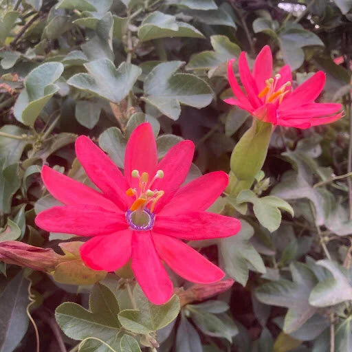 P. ‘Scarlet Flame,’ (31℉) Likely 15-20 ft. The leaves of this Passiflora are tri-lobed and large, up to 6 inches long. Truly scarlet, from the recurved petals, to the bristling corolla and anthers. A hybrid of vitifolia and coccinea.